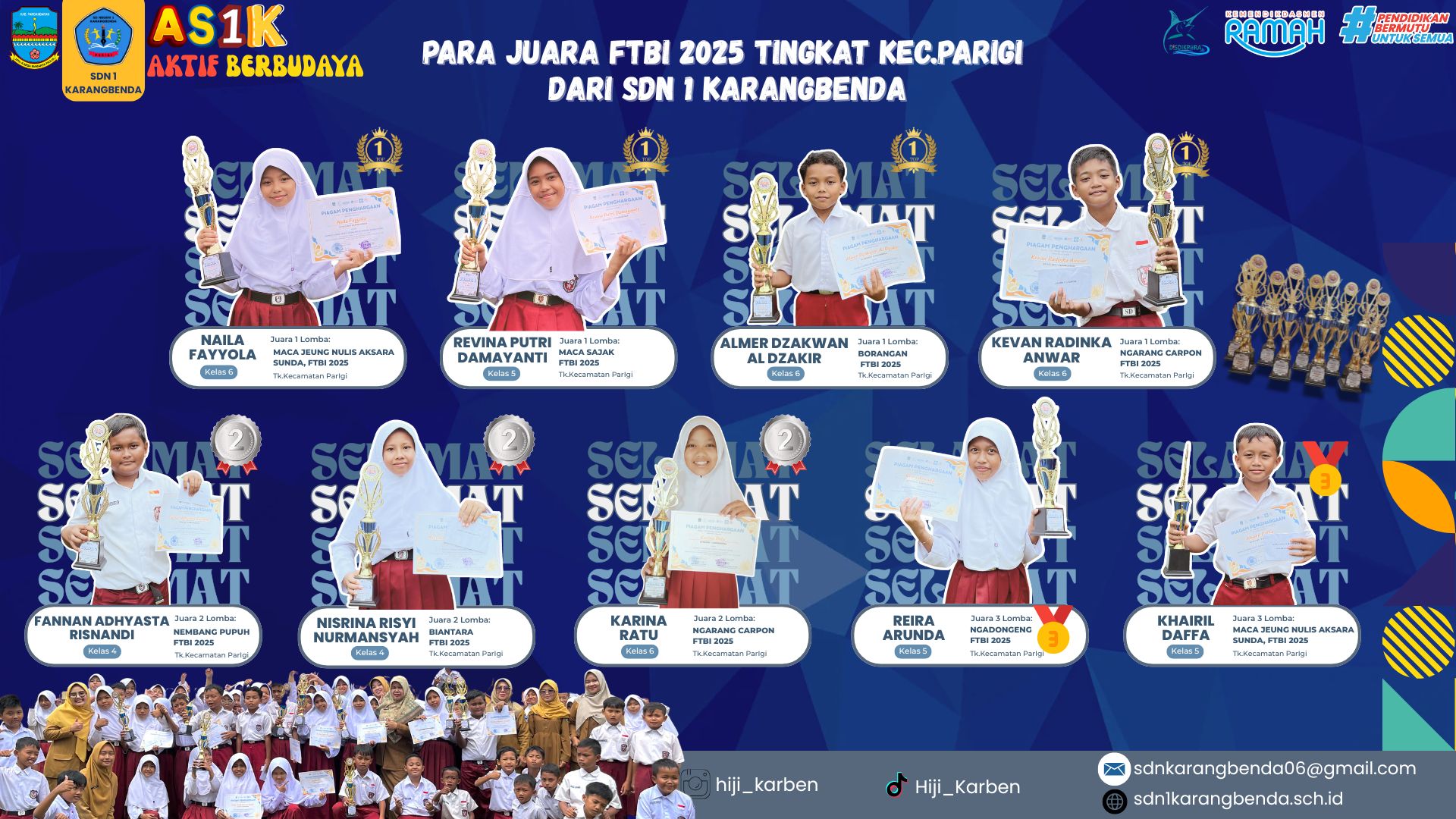 SDN 1 Karangbenda kembali menorehkan prestasi membanggakan dalam ajang Festival Tunas Bahasa Ibu (FTBI) tingkat Kecamatan Parigi. FTBI ini merupakan ajang tahunan yang bertujuan menumbuhkan rasa cinta dan bangga terhadap bahasa ibu, khususnya Bahasa Sunda. Dalam lomba tersebut, para siswa SDN 1 Karangbenda tampil gemilang di berbagai cabang lomba. Kami berhasil menyabet 9 piala dari berbagai mata lomba tersebut, diantaranya kami berhasil meraih 4 piala juara 1, 3 piala juara 2, dan 2 piala juara 3. Berikut adalah nama-nama pemenang FTBI tingkat Kecamatan Parigi dari SDN 1 Karangbenda: